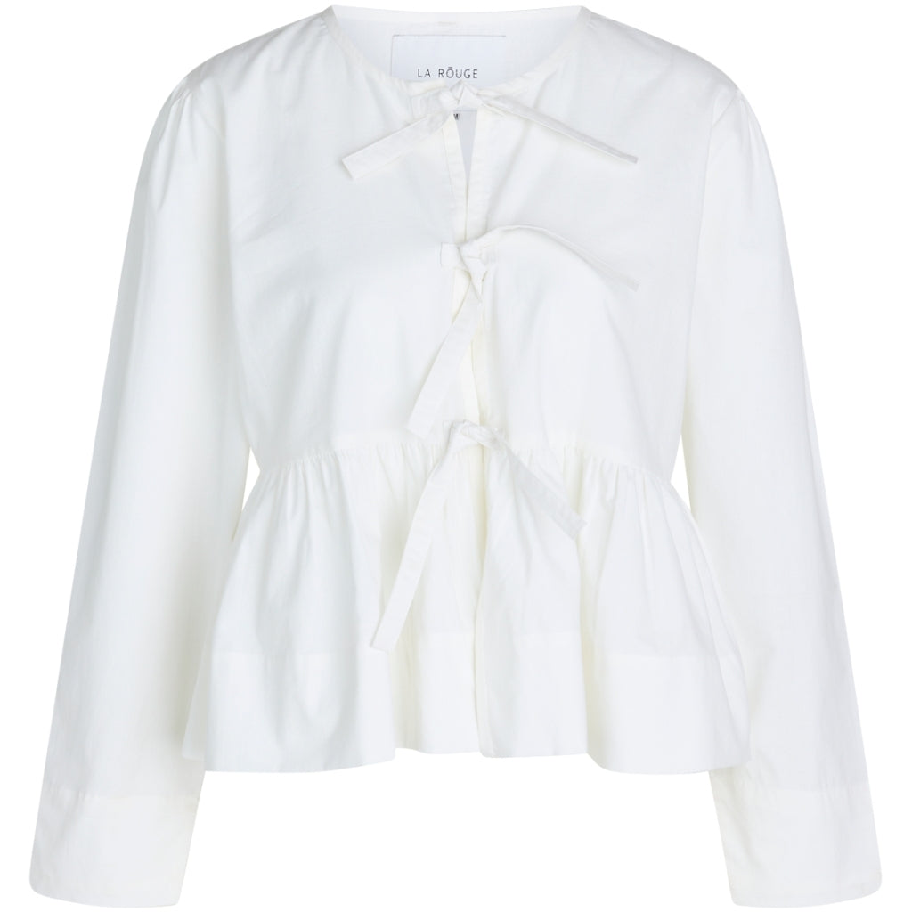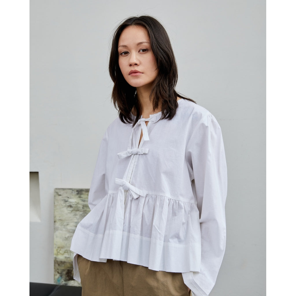 Gaby Shirt er en mega cool og feminin skjorte i 100% bomuld. Skjorten har en rund halsudskæring, peplum i bunden samt bindebånd til at lukke skjorten med. Skjortens bindebånd kan styles på forskellige måder eksempelvis som knude eller sløjfe. Skjorten kan med fordel styles med Lisa Singlet under samt vores Louise Workers Pants.